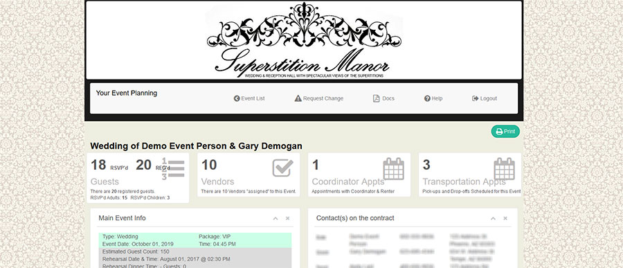 When your information is complete we have provided formatted printable overviews of your entire event's information. The Guest manager is provided as well to all booked customers.